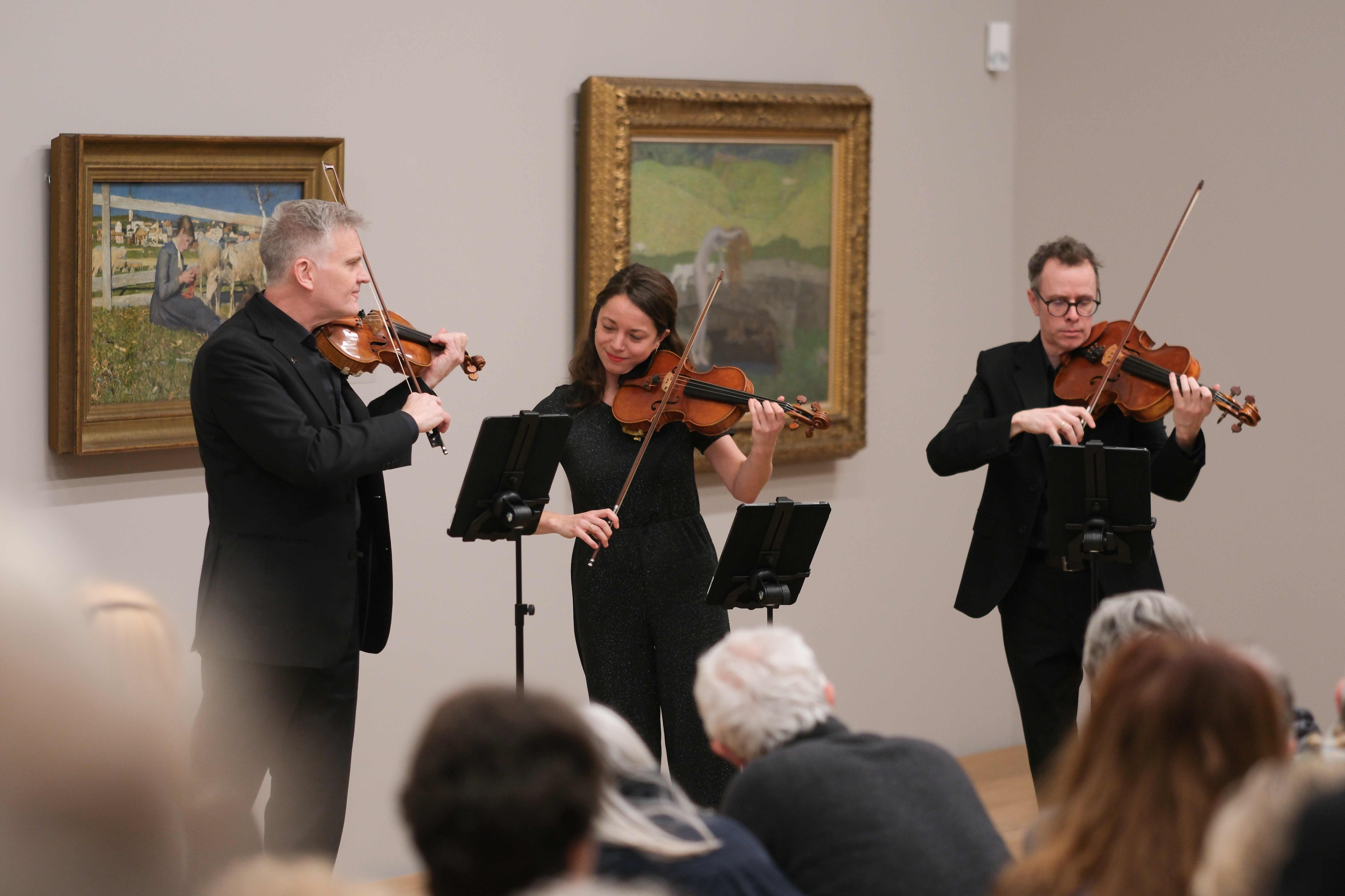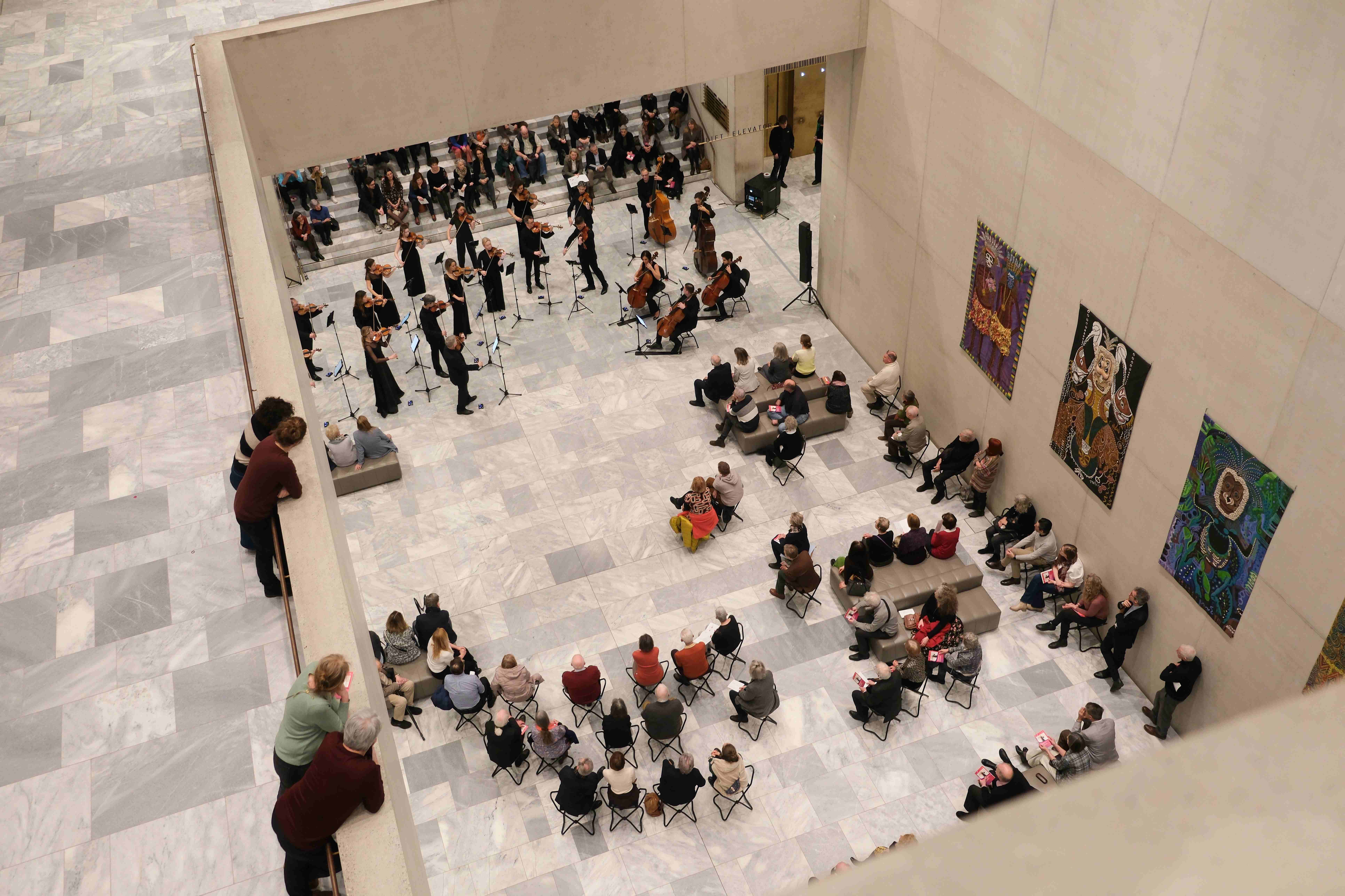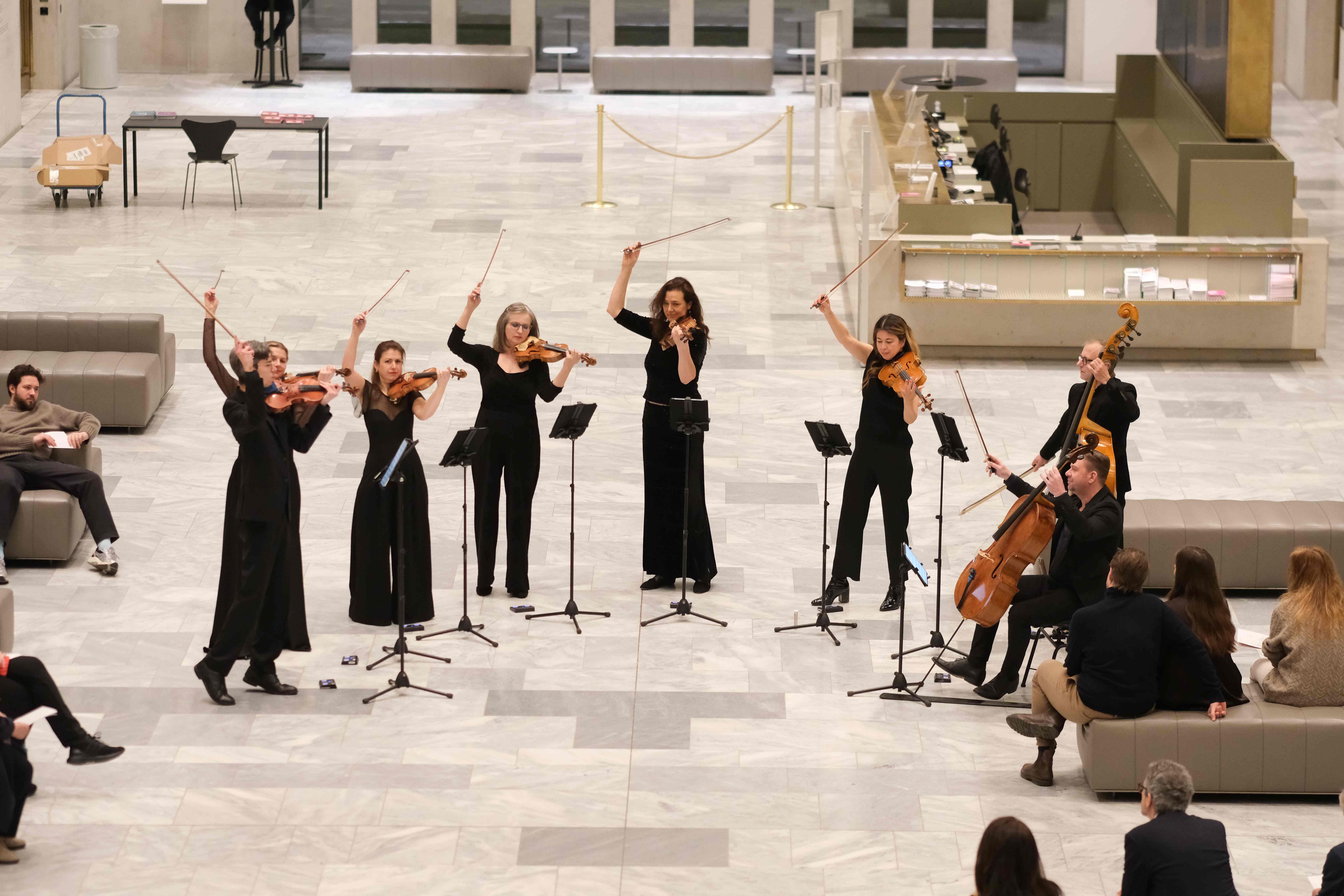 Anschliessend teilt sich das Orchester in kleinere Formationen auf und begleitet die Besucherinnen und Besucher durch die neue Ausstellung von Kerry James Marshall im 2. OG, die Sammlungsräume Merzbacher und Looser im 1. OG sowie die Kunstinstallation von Jeffrey Gibson im Foyer.